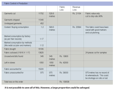 The loss of 13% of the total fabric bought is either dead stock, lost in cutting room, lost as reject garments or arrived short on rolls from mill. However, once the shipment leaves, the companies revel in the fact that they have sent more than the ordered quantity instead of realizing the fact that they actually bought extra 5% plus the other additions [shown in the example above (total is 17%)] but not converted it into earnings. It is well understood that all fabric cannot be saved; however, realizing that all of this fabric cannot be saved, a good proportion is possible!