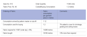 No one wants to be blamed for short shipment and so there are lots of stages where extra percentages are added. As an example the pattern master calculates consumption on medium size (2 metre) and adds extra, approximately 10 cm, to compensate for large sizes. A further 3 to 5% is added for cutting wastages and 2% for shrinkage and defects. The fabric is ordered and a further 5% is added since the buyer allows a potential 5% to be over-shipped.