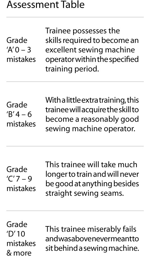 Secondly, once these potential operators pass the trainability test, they need to be put through a variety of exercises. Not only do they need to be trained on how to sew, they also need to understand the importance of the time taken to do a simple thing like changing the bobbin or a needle. They need to have standard minute values for threading the machine, changing the needle, changing the bobbin and setting the tensions.