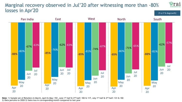 The Retailers Association of India (RAI) conducts fortnightly surveys to get knowledge of the current retail scenario in the country and their 5th edition indicates signs of marginal recovery in the month of July wherein business was down 63 per cent year-on-year (Y-o-Y) as compared to June, which experienced a decline of 67 per cent.