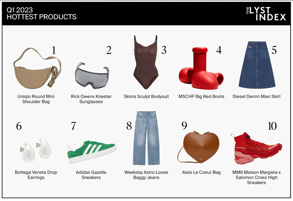 This quarter, Uniqlo’s shoulder bag takes the top spot as the hottest product of the quarter. With a price point below US $ 20, it is the most affordable product ever featured on The Lyst Index. The bag gained immense attention and went viral on TikTok, accumulating over 59 million views on the platform.