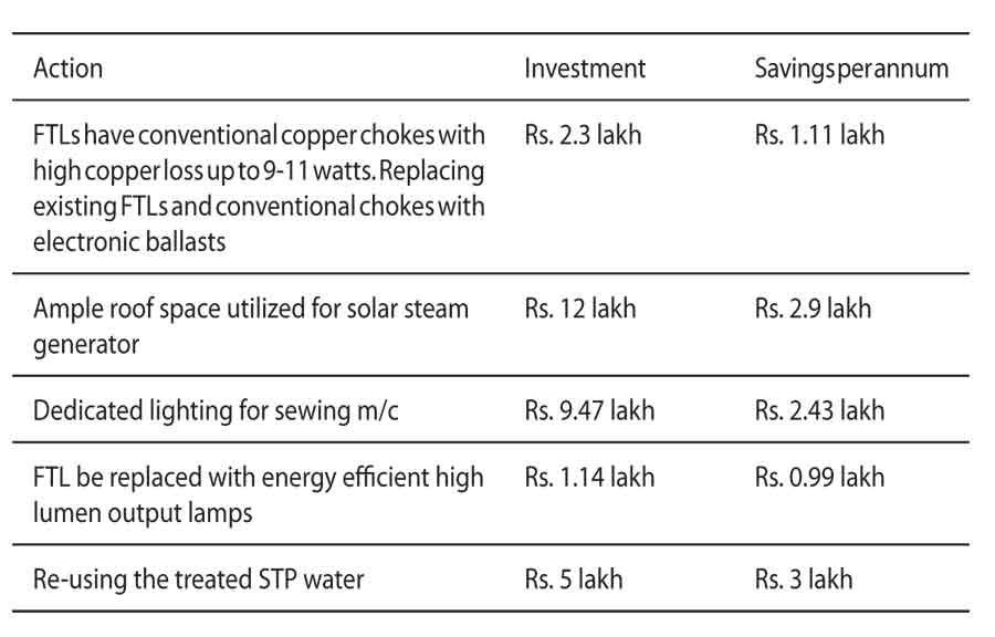 Common energy efficiency measures identified in the apparel units include – Replacement of existing inefficient FTL with energy efficient high lumen output FTL; Installation of voltage optimizer in lighting circuits to achieve energy savings; Replacement of conventional light bulbs with energy efficient lighting like LED, etc.; Installation of solar steam generators to supplement steam generated by diesel fired boilers (the diesel consumption will be reduced); Replacement of existing conventional regulators with EE electronic regulators; Pre-heating of oil with boiler exhaust gases; Reduction in water wastage & replacement of standard motors with energy-efficient ones; and Replacement of existing conventional electro-magnetic ballasts with energy efficient electronic ballasts.