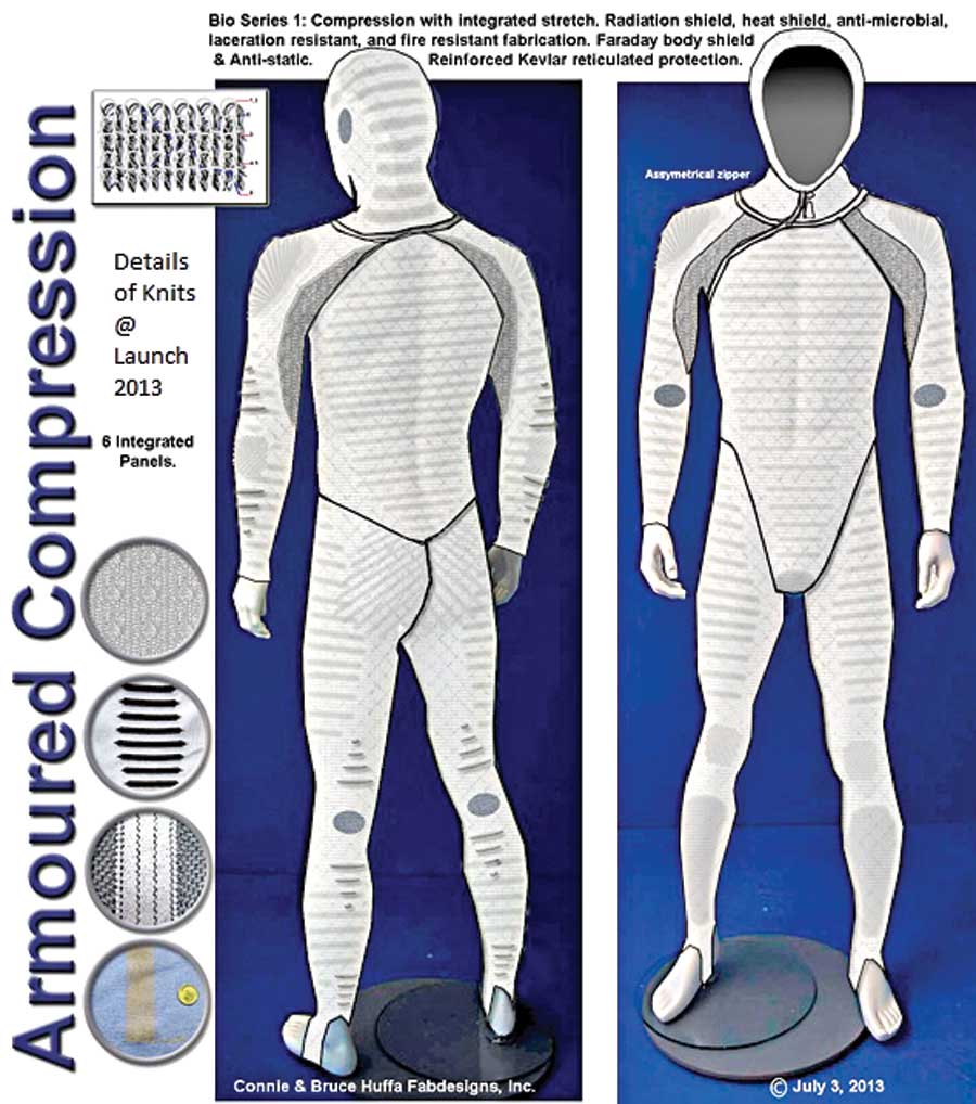 One of several concepts by Fabdesigns submitted at the LAUNCH 2013, plans to address Space Adaptation Sickness (SAS) and muscle loss. It utilizes electro stimulation, with current applied, and sensors receiving data. Much like the function of knitted brace supports and some high-tech wet suits currently on the market, Connie Huffa, Fabdesigns President and textile engineer explains, this compressive garment combats lack of gravity by: increasing circulation and venous blood flow, delays exhaustion and muscle soreness, optimizes endurance, helps the body remove lactic acid faster, improves strength and power, and encourages positive posture like an orthopaedic training garment.