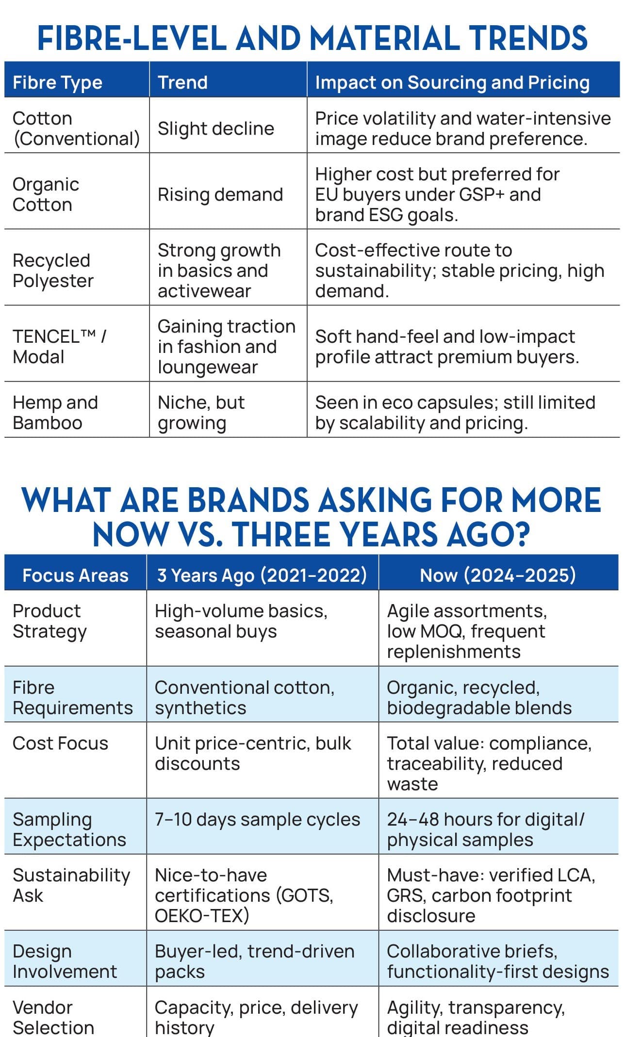 Today, the type of fibre used plays a bigger role than ever in how sourcing and pricing decisions are made. Buyers are now willing to pay higher prices for materials that come with traceability and sustainability certifications. Because of this shift, factories need to diversify their yarn sources and build flexible material plans to handle RFQs that ask for different fibre blends. It’s no longer just about finding the lowest cost per kg, pricing strategies must now reflect the added value of sustainable and certified materials. Lead times have become much shorter across most product categories, reduced by 15–25% since 2021.
