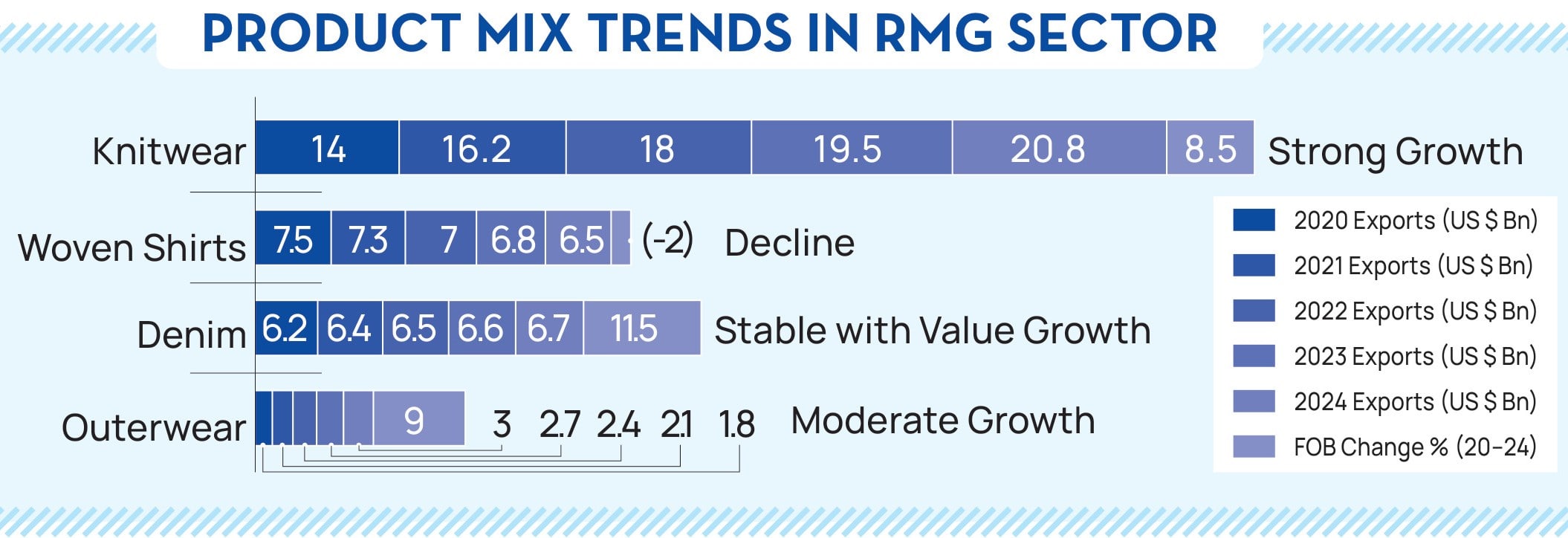 Bangladesh’s RMG industry is going through a rapid change and so is the composition of its product mix. For instance, between 2020 and 2024, global sourcing trends have been reshaped by stringent sustainability laws, changing consumer tastes, faster turnaround time and the supply chain shake-up after President Trump assumed office. One clear sign of change is the dip in woven shirt and blouse exports, which fell 8% in FY 2023–24. This points to a drop in demand or increased competition in that category. Looking at the overall picture, Bangladesh earned US $ 38.48 billion from garment exports in 2023, which was a 7.23% increase from 2022. However, in FY ’24, the earnings fell to US $ 36.13 billion, showing that the industry is now facing tougher conditions and weaker global demand.