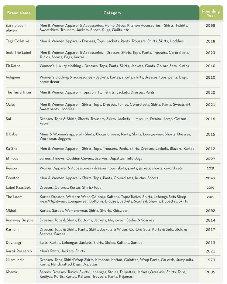 The Loom, Okhai, Label Raasleela, Runaway Bicycle, Karnam, Sui, Devnaagri, Kartik Research, Nilam India and Khamir.
