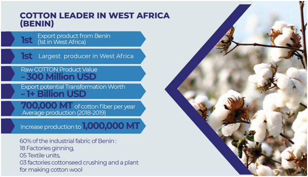 Benin offers splendid opportunity of processing the cotton bales produced in the country to meet the strong 320 million consumer’s demand in ECOWAS/UMEOA region.