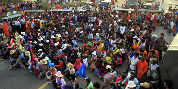 Cambodian garment workers unclear about the consequence of the labour law which is currently in its draft stage. A file photo of workers’ agitation on the outskirts of Phnom Penh, Cambodia. / Image Courtesy: https://gdb.voanews.com