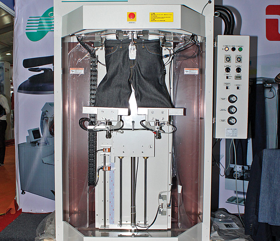 The Italian pioneer MACPI popular for its wide range of finishing, pressing and fusing machines for shirts, suits, bottoms and knitwear, displayed its MACPI32110 jean finishing machine for bottoms without pleats at the GTE recently. The machine is fitted with innovative systems for finishing of casual and denim pants made of elastic and synthetic fibres as these types of fabric cannot be treated with traditional pressing methods. It has a system for flap and front pocket pressing, bottom pressing, and a warning light to indicate the out-of-size products. Another upgraded feature is the clamp for rear belt locking, especially useful for elastic trousers. The machine is extremely operator friendly as the final touches are no longer required. The machine can be used independent of the size of garment as the machine can be fitted with different devices for different garments such as long trousers, shorts, baby’s trousers, skirts, and also for overalls.