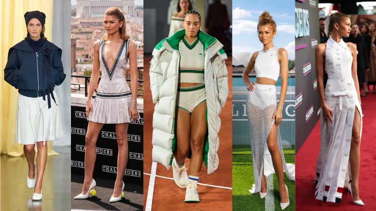 According to BuzzFeed, during the promotional tour for the movie Challengers, Zendaya showcased numerous tennis-inspired outfits further fuelling the viral nature of this trend. In the film, she portrays Tashi, a professional tennis player who transitions into coaching after sustaining an injury during a match. On the runways, Charaf Tajer of Casablanca has been championing the ‘Tenniscore’ look for the past several seasons. Look 36 in his F/W ’23 collection featured a tennis-inspired white mini dress with a polo collar and red, black and green tipping and trim. He continued this theme for F/W ’24, presenting Look 37, which featured a white knit top and pleated skirt with green detailing and trim, styled with ‘Greek-inspired’ accessories.