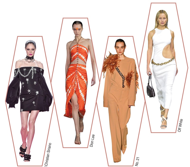Designers are accentuating basics and sober outfits by introducing edgy hardware detailing into their collections. Linked metallic chains and punky chains are in for Fall/Winter 2020. Be it dangling in the form of a belt across the waist, or going all out by using body chains as a garment altogether (à la Area) or even elaborate chain dresses (à la Salvatore Ferragamo), chains are prevalent across the international fashion runways.