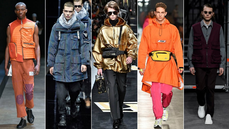 The trend of lengths took a new turn as the conventional baggy and boxy silhouettes were abandoned to give way to more body accentuating styles such as classic coats, puffer jackets, anoraks, as well as trenches, which were constricted by the use of waist belts.