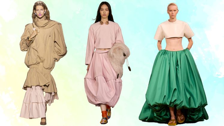Khaite presented puffed blouses that introduced a sense of romantic restraint by being voluminous yet balanced at the same time, owing to its tailored foundations. Balenciaga, on the other hand, leaned into its architectural DNA, showcasing balloon-hem skirts that fused ’80s nostalgia with futuristic precision. Across runways, designers used rounded shapes to redefine proportion and silhouette, framing the body in new ways while maintaining a sense of lightness.