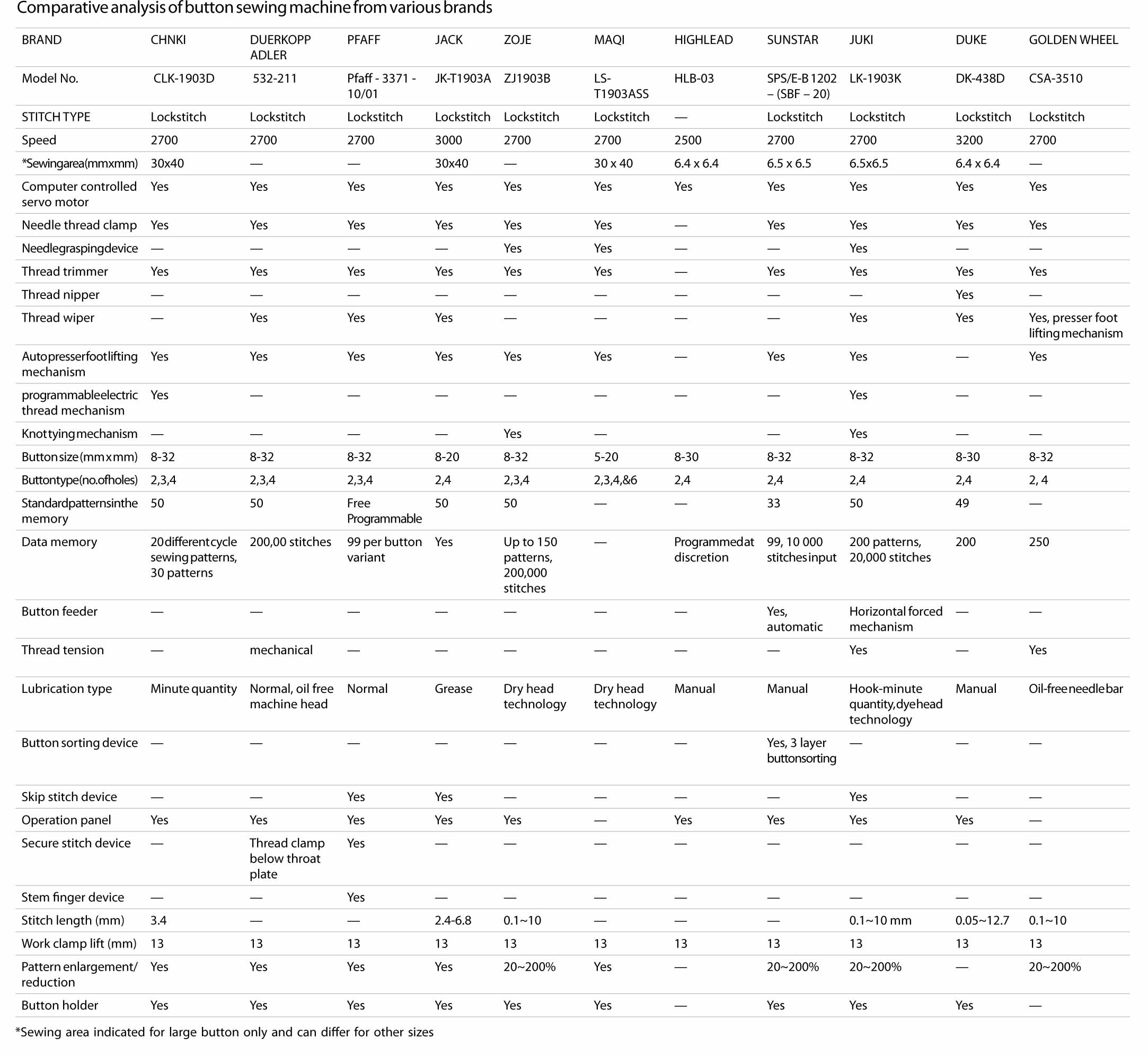Many brands offer active tension mechanisms standard feature which enables setting of needle thread tension that matches various sewing conditions such as thread, material and sewing speed. All the models can be used to sew buttons with the diameter ranging between 8 mm – 32 mm capable of sewing varying stitch length between 0.1 mm – 12.7 mm with intermittent or continuous feed system. Even the button sewer patterns can be reduced or enlarged (10% to 200%) to suit different buttons, by using the simplified push button given on operator control panel.