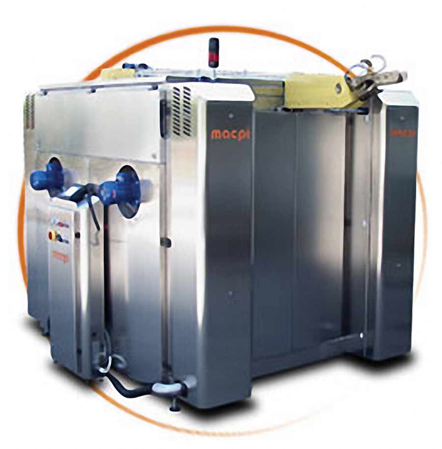 The Macpi steam tunnel, for example, for garments pressing, refurbishing and finishing comes in various models. The construction is in stainless steel, the walls are made by insulating material and the loader/conveyor/unloader is compatible with most common transport systems. The working cycle takes place within a closed unit. The fluids, steam and overheated air, are put into forced circulation both clockwise and anticlockwise. Steaming time, steam pressure and temperature, clockwise and anti-clockwise ventilation (time, capacity, temperature, blowing for pins cooling (time) and the distance of pins loading can all be pre-specified using a palm PLC with a graphic touch screen display into 20 available programmes.