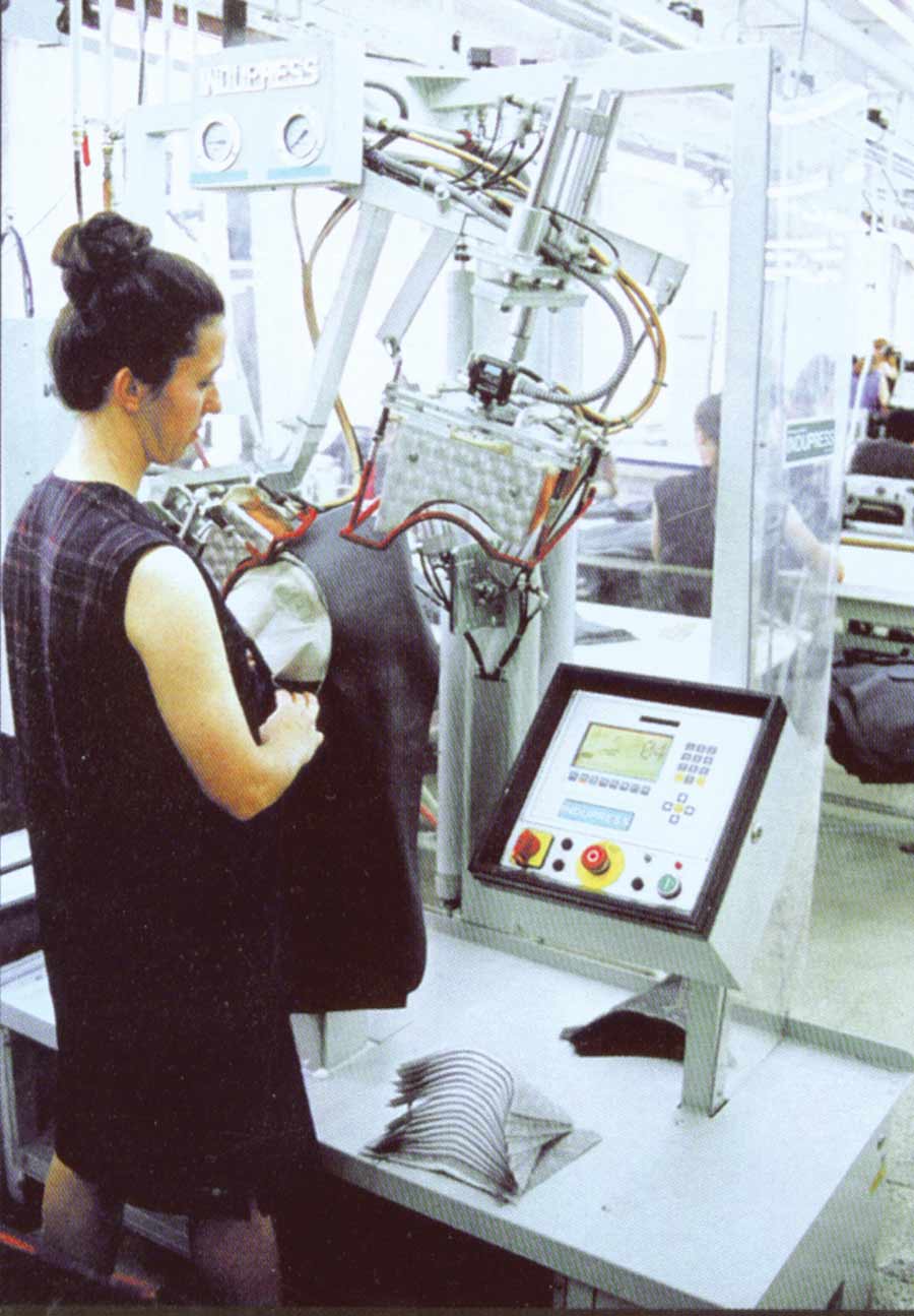 Digital programming helps in achieving consistent quality levels for different materials providing control on all aspects such as temperature, steam time, steamair time, air time, steam and air volumes and directional flow. Specialized fans can help with speedy drying of the fabric. Vacuum areas can help hold specific parts of the garment in place whilst loading the form. Programmable and adjustable seam tensioning devices can help minimize any puckering.