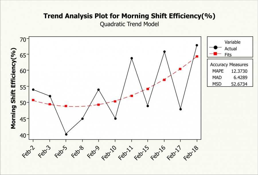 MAPE, MAD and MSD are three statistical measures which helps determine the accuracy of the fitted trend line. For all three measures, the smaller the value, the better the fit of the trend line. When the trend lines were being fitted to efficiency data and fall out data, out of all the possible trend models, only quadratic trend model returned the lowest values for MAPE, MAD and MSD and which was later chosen as quadratic model to explain the trend of efficiency and garment fall out.