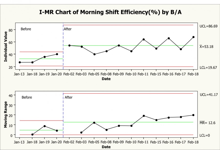 The Chart 2 compares during pilot sewing efficiency with before-pilot sewing efficiency. According to the above control chart, during-pilot efficiency figures had been higher than before pilot where mean efficiency during the pilot was 53.18% while the mean efficiency before pilot was 32.26%. This was all possible only because real-time efficiency was recorded on the display board during the pilot. The increase in efficiency during the pilot was again attributed to the fact that during the pilot an e-mail alert was sent to production managers on cumulative target efficiency vs. cumulative actual efficiency every half an hour so that production managers could motivate operator girls to do better on efficiency every time it drops. Another reason why the efficiency went up during the pilot was that since real-time efficiency information was available supervisors, production managers and production executives could find the possible reasons for declining efficiency a lot faster. Because the issues with efficiency were found a lot faster, supervisors solved those issues a lot faster and soon got efficiency on an even keel.