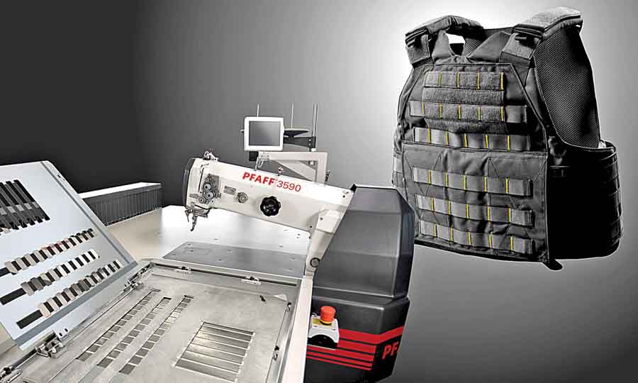 The PFAFF 3590-6/8540 extends the features of the product generation by a variation with zigzag machine head, enabling all versions to be equipped with the same in the future. The predestined area of use is on products such as, tactical vests or outdoor goods with a number of bartacks to be sewn. The machine can be converted for straight stitch work by changing the parts set.